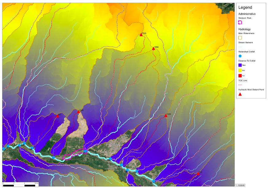 This network was ranked by r.stream extension in GRASS to build Hortons and Hacks stream ordering. Then a distance to outlet surface grid was generated and analyzed by zonal statistics to find the farthest point. Next, r.drain in GRASS to trace a time of concentration line. Finally v.net in GRASS was used to build a network of pour points, flow paths, TOC paths, and HMDP for each watershed. In this workflow, the QGIS tool attribute by location was invaluable.