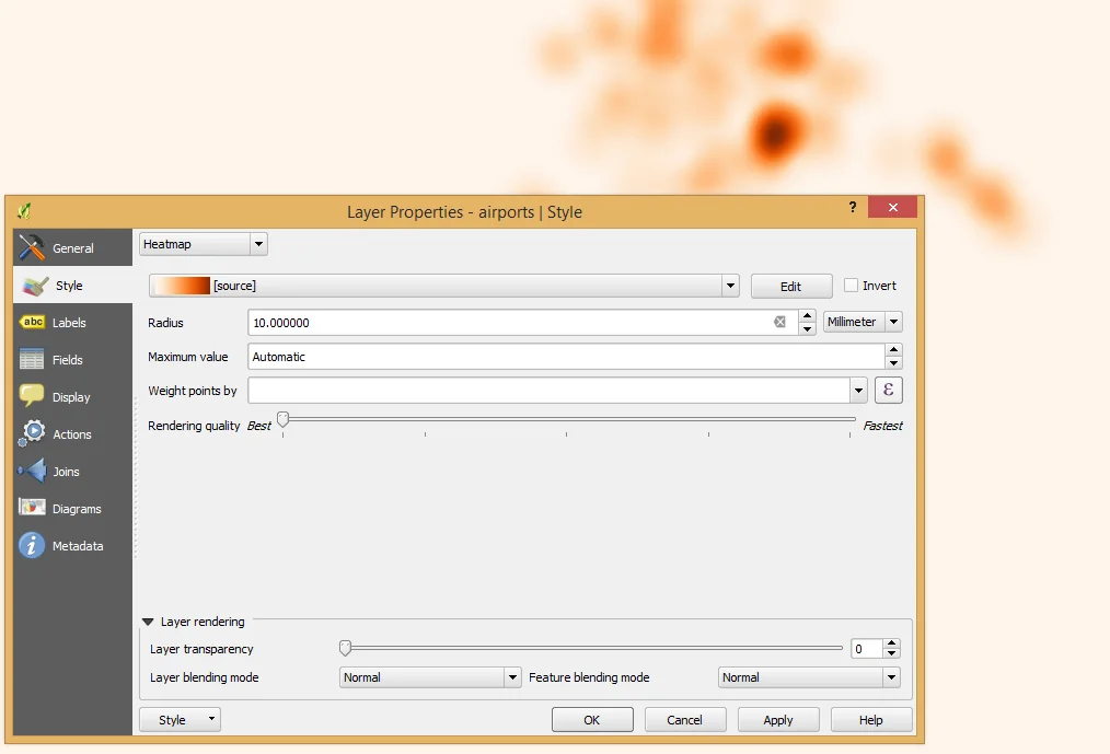 Options include specifying heatmap radius in pixels, mm or map units, choice of color ramp,weighting points by field, and a slider for selecting a tradeoff between render speed and quality.
