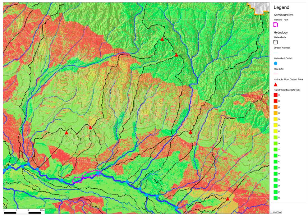 This network was ranked by r.stream extension in GRASS to build Hortons and Hacks stream ordering. Then a distance to outlet surface grid was generated and analyzed by zonal statistics to find the farthest point. Next, r.drain in GRASS to trace a time of concentration line. Finally v.net in GRASS was used to build a network of pour points, flow paths, TOC paths, and HMDP for each watershed. In this workflow, the QGIS tool attribute by location was invaluable.