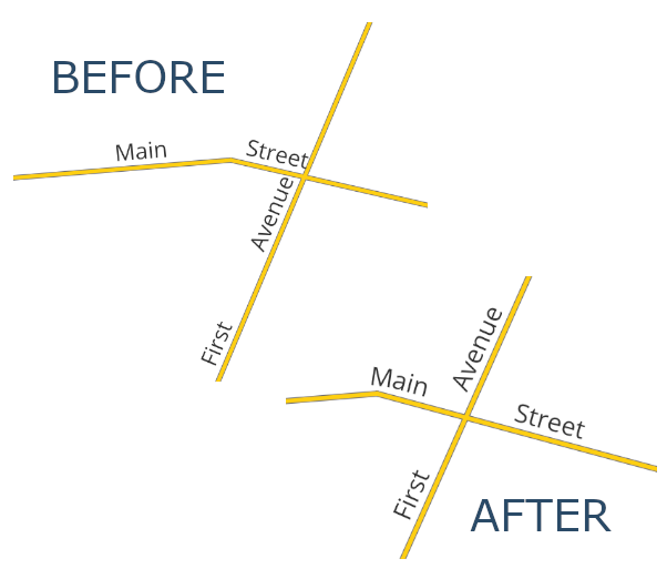 • Place characters at vertices: When this mode is selected, each individual character from the label text is placed such that their left-baseline position is located at a corresponding vertex from the curved line geometry, i.e., the first character will be placed at the start of the line, the second at the second vertex, the third at the third vertex, etc. If the curved line geometry does not contain sufficient vertices for the characters present in the label text, then the excess characters are ignored and will not be rendered. If the label’s “distance” setting is non-zero, then the character will be vertically offset from the vertex position by this distance. Characters are rotated to follow the line angle at the vertex.