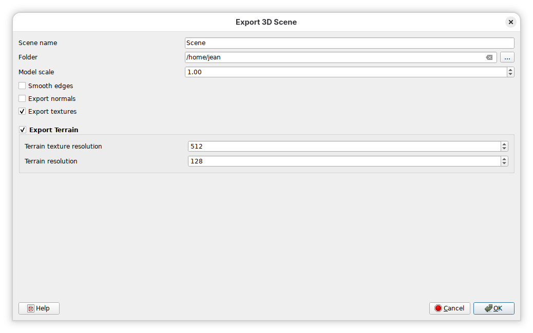 A new option to enable or disable terrain export is provided on the dialog for 3D scene exports. Terrain options are always activated, even when terrain rendering is disabled. The terrain resolution option is only relevant for DTM or online terrain - it must be disabled for other terrain types.