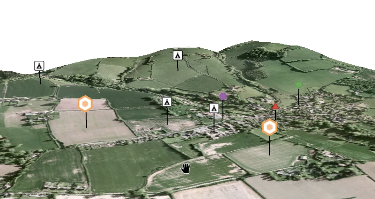 Users have control over the terrain clamping and offset for the billboards, and whether or not “callout” lines should be shown (vertical lines joining the billboard to the corresponding location on the terrain surface).