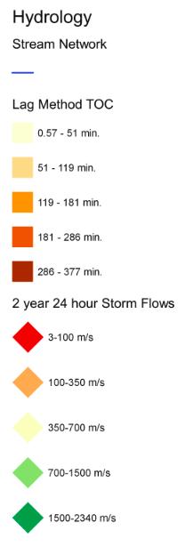 This network was ranked by r.stream extension in GRASS to build Hortons and Hacks stream ordering. Then a distance to outlet surface grid was generated and analyzed by zonal statistics to find the farthest point. Next, r.drain in GRASS to trace a time of concentration line. Finally v.net in GRASS was used to build a network of pour points, flow paths, TOC paths, and HMDP for each watershed. In this workflow, the QGIS tool attribute by location was invaluable.