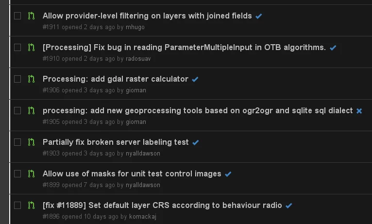 In our ongoing quest to improve the stability and quality of QGIS, every commit is now tested against a growing test suite to identify regressions automatically. In the image on the right you can see the list of incoming pull requests on our GitHub page are now automatically annotated with a check or cross based on whether our test suite successfully ran on Travis.ci when the pull request is made or updated.