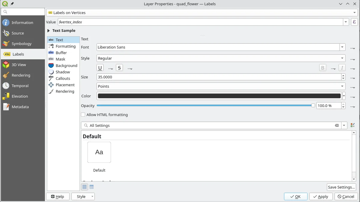 In 3.36 we’ve added labeling support for mesh layers. Labels can be applied to mesh vertices, or mesh faces, and can take advantage of all the advanced formatting options and appearance settings that you get for vector labels. Labelling settings are available through layer properties dialog and the layer styling panel. Toggling mesh labels on and off can also be conveniently done through the layer panel’s context menu.