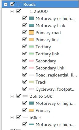 Advanced users who leverage QGIS's rule based renderer system will be pleased to see that the rules are now presented as a tree in the legend. Better still, each node in the tree can be toggled on/off individually providing for great flexibility in which sublayers get rendered in your map.