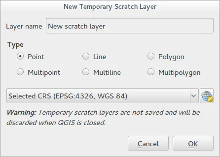 This release add support for creating new temporary scratch layers within QGIS core. Scratch layers can be created in the Layer --> Create layer --> New Temporary Scratch Layer menu option.