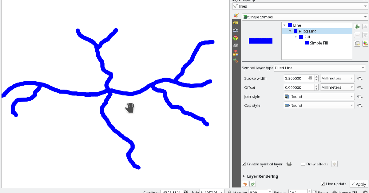 We’ve added a brand new line symbol type for “filled lines”. Much like the older “Filled marker” symbol type offers for marker symbols, this option will render lines using any QGIS fill symbol. This means you can now render lines filled with gradients, line hatches, raster fills, and much more!