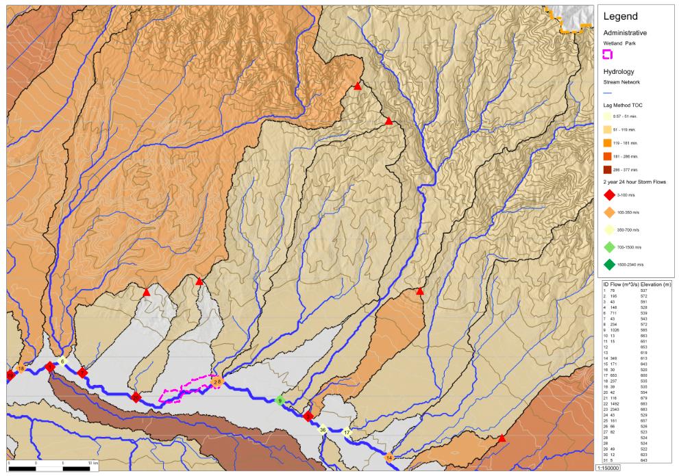 This network was ranked by r.stream extension in GRASS to build Hortons and Hacks stream ordering. Then a distance to outlet surface grid was generated and analyzed by zonal statistics to find the farthest point. Next, r.drain in GRASS to trace a time of concentration line. Finally v.net in GRASS was used to build a network of pour points, flow paths, TOC paths, and HMDP for each watershed. In this workflow, the QGIS tool attribute by location was invaluable.